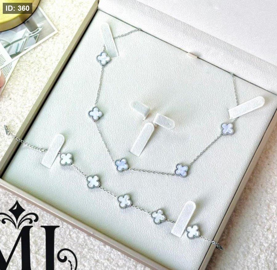 بساطة راقية بلون أبيض ناعم يرمز للنقاء. العقد والسوار يمنحانك لمسة أنثوية كلاسيكية تناسب كل الأوقات.
