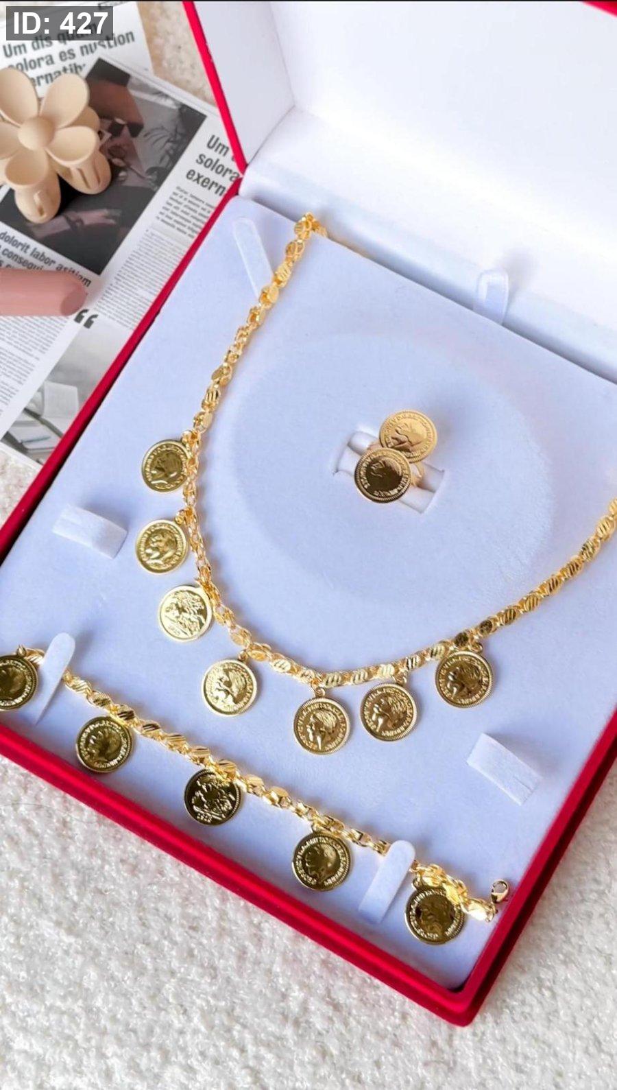 عقد وخاتم وسوار مزين بعملات معدنية مطلية بالذهب بتصميم كلاسيكي