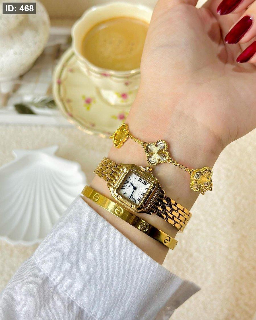 ساعة فاخرة بتصميم كلاسيكي بسوار معدني ذهبي لامع مع وجه مربع بأرقام رومانية أنيقة، تضيف لمسة من الرقي والفخامة إلى إطلالتك اليومية والمناسبات الخاصة. يمكن تنسيقها بسهولة مع الأساور الذهبية لمظهر أكثر جاذبية